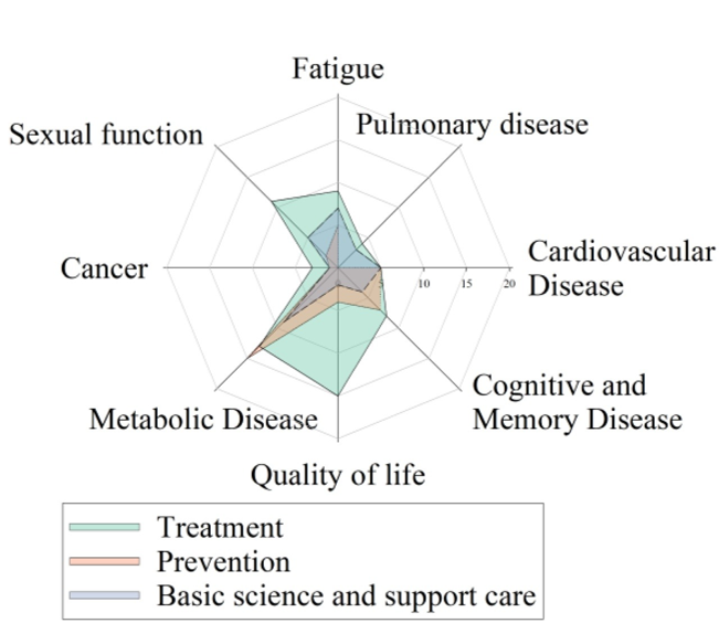 จากกราฟข้างต้นแสดงถึงสมบัติการป้องกัน และรักษาอาการต่างของโสมดังนี้ โสมถูกใช้ในการรักษาอาการที่เกี่ยวข้องกับโรคเกี่ยวกับระบบสืบพันธ์ รวมไปถึงอาการเหนื่อยล้า อีกทั้งโสมยังสามารถป้องกัน และรักษาโรคอ้วน โรคที่เกี่ยวข้องกับการเรียนรู้และความจำ จากการศึกษาข้อมูลจากงานวิจัยหลากหลายฉบับ 79.8 %ของงานวิจัยแสดงให้เห็นว่าโสมมีบทบาทในเชิงบวกต่อสุขภาพอย่างมาก
