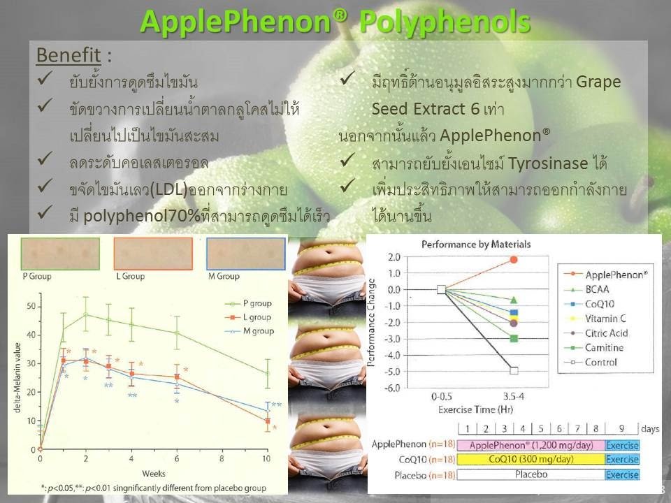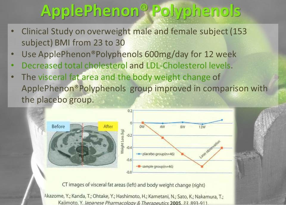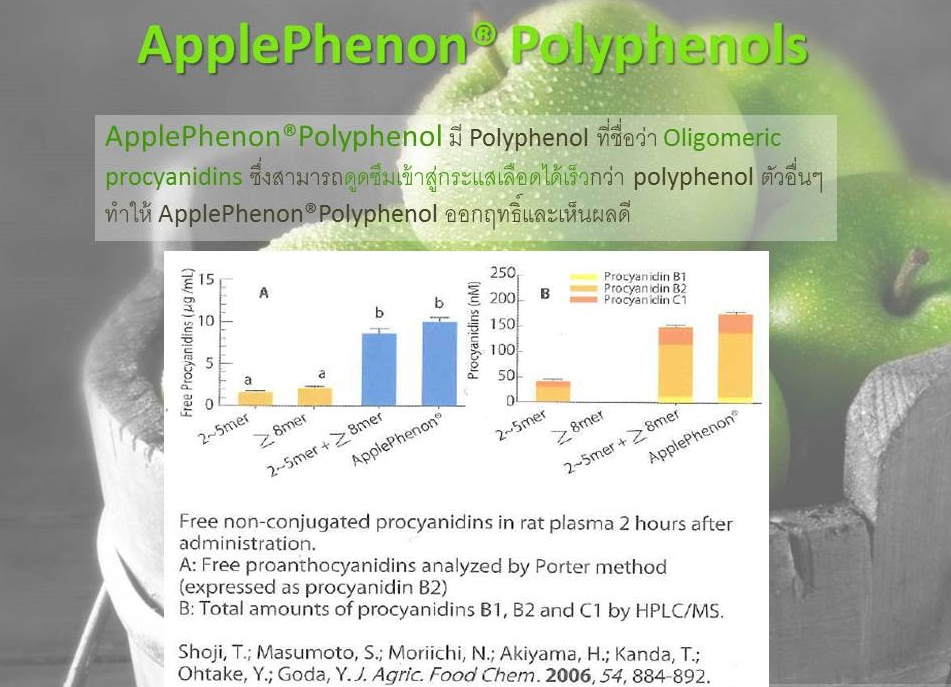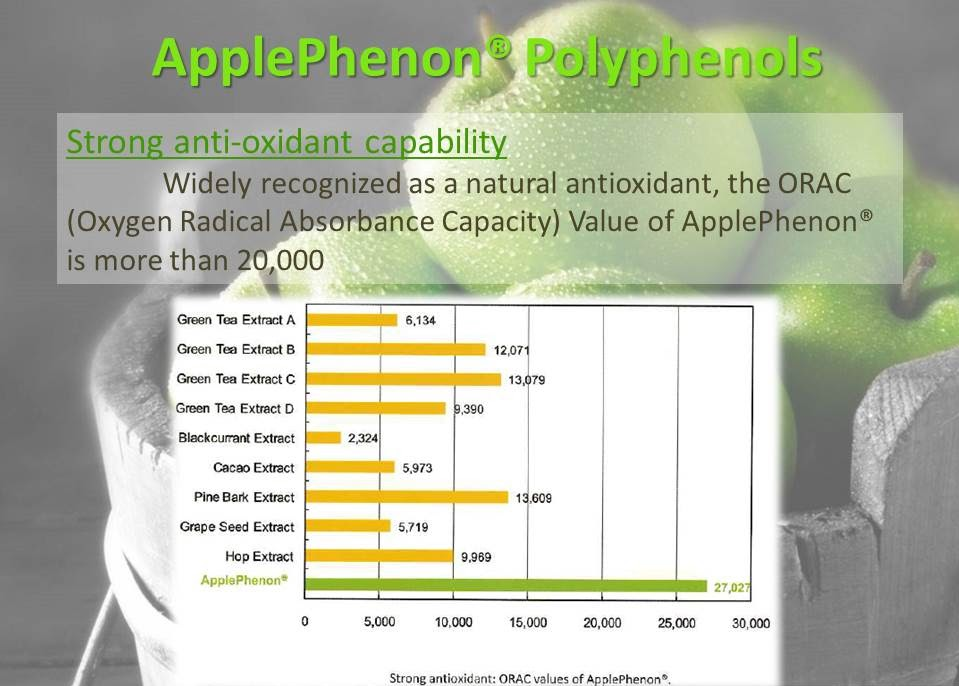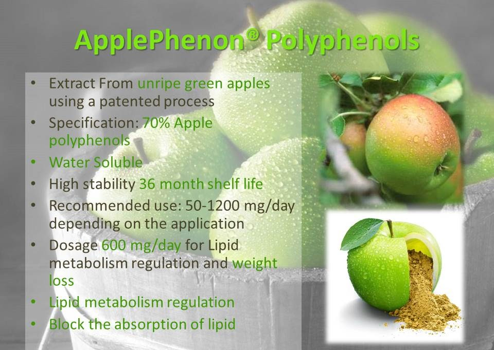 ApplePhenon®Polyphenol สารสกัดจากผลอ่อนแอปเปิ้ลป่า จากสายพันธุ์ Malus domestica หรือ Malus pumila เป็นผงละเอียดสีน้ำตาลอมส้มอ่อนๆ สามารถละลายน้ำได้ มีรสชาติฝาดเล็กน้อย มีสารสำคัญคือ Polyphenol ชื่อว่า Oligomeric procyanidins ซึ่งสามารถดูดซึมเข้าสู่กระแสเลือดได้เร็วกว่า polyphenol ตัวอื่นๆ ทำให้ ApplePhenon®Polyphenol สามารถดูดซึมได้เร็ว ทำให้สามารถออกฤทธิ์และเห็นผลดี