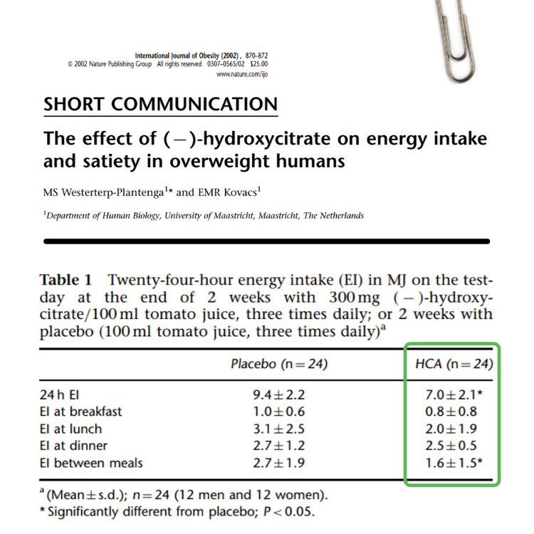 จากการศึกษาผลของไฮดรอกซีซิเตรทต่อปริมาณอาหารที่เข้าไปในร่างกาย (พลังงานที่ได้รับ) และความอิ่มในผู้ที่มีน้ำหนักเกิน โดยให้ผู้ที่มีน้ำหนักเกินทั้งชาย และหญิงรับประทานไฮดรอกซีซิเตรท เป็นระยะเวลา 2 สัปดาห์เปรียบเทียบกับกลุ่ม Placebo พบว่า ปริมาณอาหารต่อมื้อ และปริมาณอาหารรวม 24 ชั่วโมงที่เข้าไปในร่างกายน้อยกว่ากลุ่ม Placebo 15-30% ลดลงอย่างมีนัยสำคัญ และปริมาณน้ำหนักตัวลดลงเล็กน้อย แต่ความรู้สึกอิ่มยังคงเดิม ดังนั้นการรับประทานไฮดรอกซีซิเตรทจึงสามารถลดปริมาณอาหารที่เราจะรับประทานเข้าไปได้โดยเรายังรู้สึกอิ่มเช่นเดิม