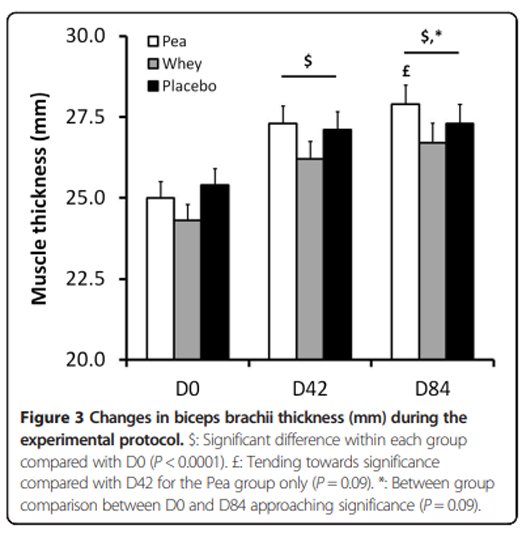 Pea proteins oral supplementation promotes muscle thickness gains during resistance training: a double-blind, randomized, Placebo-controlled clinical trial vs. Whey protein , 2015
