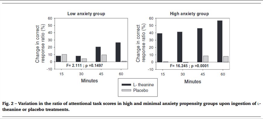 จากการวิจัยพบว่า แอล-ธีอะนีน ช่วยให้สมองปลดปล่อยคลื่นสมองอัลฟามากขึ้น และลดการปลดปล่อยคลื่นสมองเบต้าลง ทำให้ลดความเครียด และผ่อนคลายมากขึ้น มีผลทำให้จิตใตสงบ มีสมาธิมากขึ้น ไม่หงุดหงิด อีกทั้ง แอล-ธีอะนีนยังลดระดับของ คอติโคสเตอโรน ซึ่งเป็นฮอร์โมนความเครียด