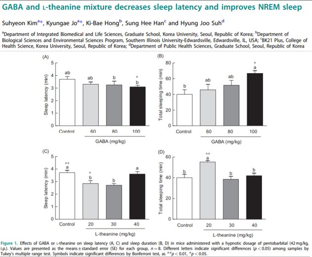 จากการทดสอบผลการเพิ่มประสิทธิภาพการนอนหลับของ GABA/L-Theanine พบว่า ส่วนผสม GABA/L-Theanine (100/20 มก./กก.) สามารถลดระยะเวลา Sleep latency (ระยะเวลาตั้งแต่เข้านอนจนถึงเริ่มหลับ) ลงถึง 14.9% และยังสามารถเพิ่มระยะเวลาในการนอนหลับได้ถึง 26.8% เมื่อเทียบกับการรับประทานแค่ GABA หรือ L-Theanine เพียงอย่างเดียว