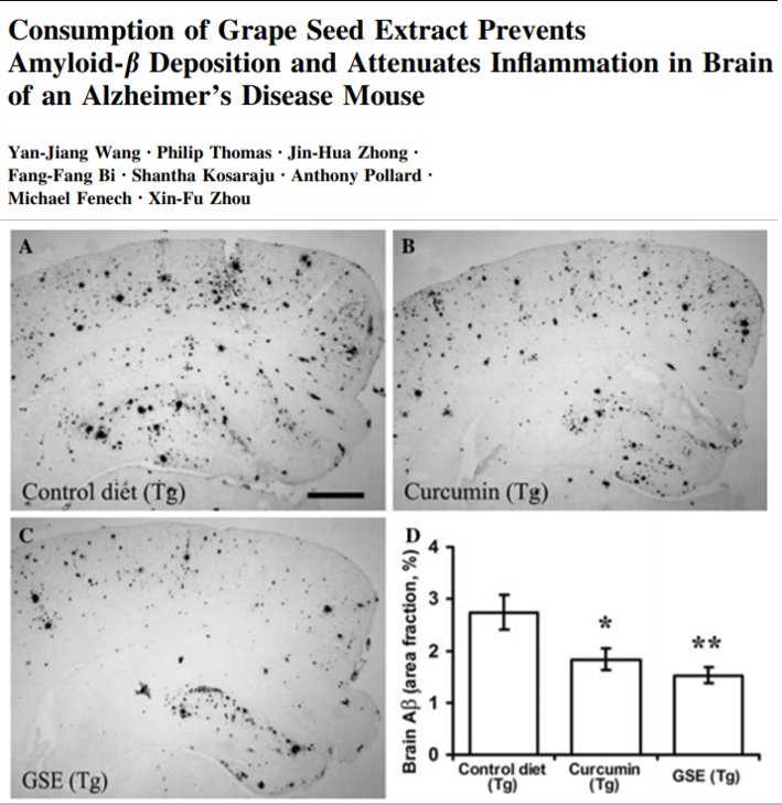 จากการศึกษาผลการรักษาโรคอัลไซเมอร์ในหนูหนูดัดแปลงพันธุกรรมของสารสกัดจากเมล็ดองุ่น โดยให้หนูรับประทานอาหารปกติ อาหารที่ผสมสารสกัดขมิ้น และอาหารที่ผสมสารสกัดเมล็ดองุ่น พบว่าในสมองของหนูที่ระบประทานสารสกัดเมล็ดองุ่นมีคราบที่เกาะในสมองน้อยที่สุดเมื่อเทียบกับหนูที่รับประทานอาหารปกติ และสารสกัดขมิ้น ดังนั้นจึงสรุปได้ว่าสารสกัดเมล็ดองุ่นสามารถยับยั้งการรวมตัวของ amyloid-beta (โปรตีนที่เป็นสาเหตุของโรคอัลไซเมอร์) และลดการผลิต amyloid-beta โดยไม่มีผลข้างเคียงเมื่อรับประทานเป็นเวลานาน