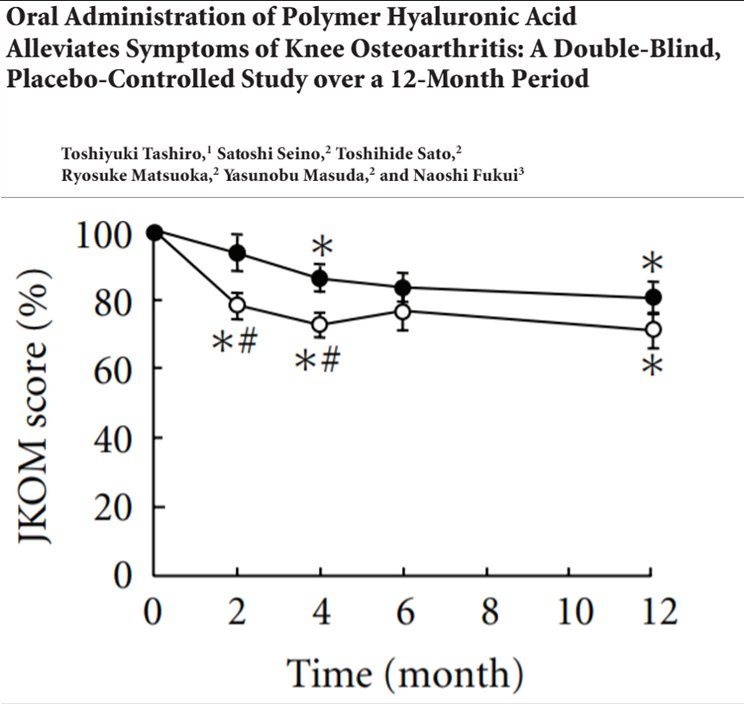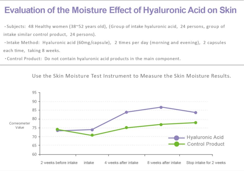 จากผลการศึกษาประสิทธิภาพของ Hyaluronic Acid ในการช่วยเพิ่มความชุ่มชื้นให้แก่ผิวในอาสาสมัครผู้หญิงอายุ 38-52 ปี จำนวน 48 คน โดยให้อาสาสมัครกลุ่มที่ 1 รับประทาน Hyaluronic Acid 60 mg/capsule ครั้งละ 2 แคปซูล เช้า-เย็น เป็นเวลา 8 สัปดาห์ และอาสาสมัครกลุ่มที่ 2 ไม่ได้รับประทาน Hyaluronic Acid พบว่า หลังรับประทาน Hyaluronic Acid สามารถเพิ่มความชุ่มชื้นให้แก่ผิวได้ภายใน 4 สัปดาห์ และเมื่อหยุดรับประทานพบว่าผิวยังคงมีความชุ่มชื้นมากกว่ากลุ่มที่ไม่ได้รับประทาน Hyaluronic Acid