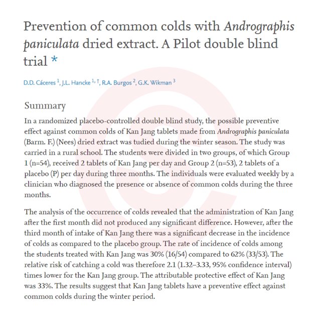 จากการทดลองทางคลินิกแบบ randomized, double-blind, placebo controlled trial เพื่อทดสอบประสิทธิผลของยา Kalm Cold TM ซึ่งเป็น สารสกัดใบฟ้าทะลายโจรเทียบกับยาหลอก ในการรักษา การติดเชื้อในระบบทางเดินหายใจส่วนต้น (Uncomplicated upper respiratory tract infection (URTI)) จำนวน 223 ราย (เพศชาย 143 ราย และเพศหญิง 80 ราย) อายุระหว่าง 18-60 ปีโดยให้ได้รับ Kalm Cold TM ขนาด 200 มิลลิกรัม/วัน (รับประทานครั้งละ 100 มิลลิกรัม หลังอาหารเช้าและเย็น) เป็นเวลา 5 วัน พบว่ากลุ่มที่ได้รับ Kalm Cold TM มีอาการโดยรวมดีขึ้นกว่ายาหลอก รวมทั้งผู้ป่วยที่ได้รับ Kalm Cold TM มีอาการข้างเคียง ได้แก่ อาเจียน เลือดกำเดาไหล ลมพิษ และท้องเสีย ไม่แตกต่างกับกลุ่มที่ได้รับยาหลอก และอาการทั้งหมดสามารถหายไปได้เอง โดยไม่ต้องได้รับการรักษา