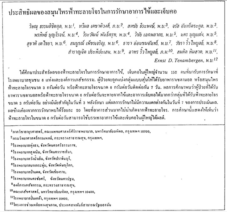 ฟ้าทะลายโจร มีชื่อวิทยาศาสตร์ว่า Andrographis paniculata (Burm.f.) Wall. ex Nees ส่วนที่อยู่เหนือดิน (aerial parts) ถูกนำมาใช้ ในการรักษาไข้หวัดใหญ เจ็บคอ แผลในปาก หรือบนลิ้น อาการไอเฉียบพลันหรือเรื้อรัง และเป็นสมุนไพรสามัญประจำบ้าน อยู่ในบัญชียาหลักแห่งชาติ ได้มีการศึกษาวิจัยเกี่ยวสมุนไพรฟ้าทะลายโจรกันอย่างแพร่หลาย มีข้อมูลสนับสนุนจากงานวิจัยทางคลินิก พบว่า สมุนไพรฟ้าทะลายโจรมีส่วนช่วยรักษาอาการของโรคติดเชื้อเฉียบพลันของระบบทางเดินหายใจ (acute respiratory tract infection) เช่น อาการไอ อาการเจ็บคอได้ดี