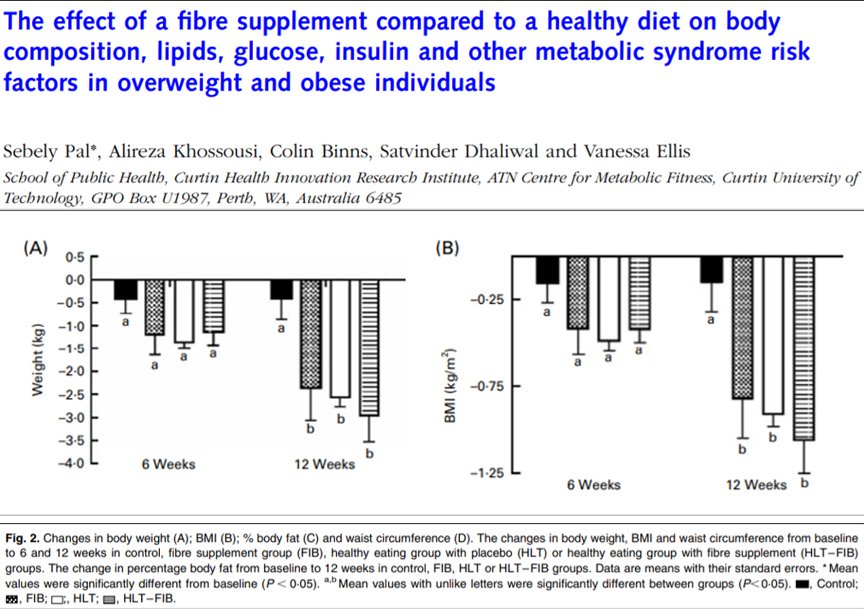 พบว่าที่ 12 สัปดาห์ น้ำหนัก และค่า BMI ของกลุ่มที่รับประทานใยอาหาร (กลุ่มที่ 2 และ 4) ลดลงอย่างมีนัยสำคัญเมื่อเทียบกับกลุ่มที่รับประทานยาหลอก