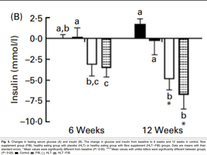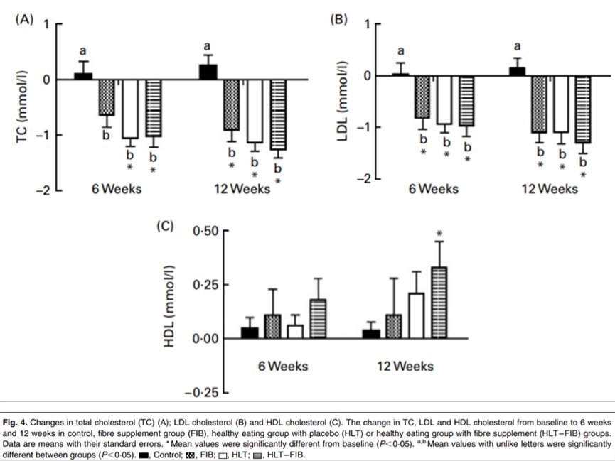 พบว่าที่ 12 สัปดาห์ Total cholesterol และ LDL (ไขมันไม่ดี) ของกลุ่มที่รับประทานใยอาหาร (กลุ่มที่ 2 และ 4) ลดลงอย่างมีนัยสำคัญ และ HDL (ไขมันดี) เพิ่มขึ้นอย่างมีนัยสำคัญเมื่อเทียบกับกลุ่มที่รับประทานยาหลอก