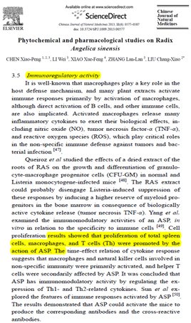 สาร polysaccharide ในตังกุยมีฤทธิ์กระตุ้นภูมิคุ้มกันโดยการควบคุม expression ของ Th1 และ Th2 (เซลล์เม็ดเลือดขาว) ที่มีความสัมพันธ์กับ cytokine เพิ่มจำนวน macropgage, T-cell และ IL-2, IFN-gamma อีกด้วย ทำให้มีประสิทธิภาพในการทำลายสิ่งแปลกปลอมได้ดีขึ้น