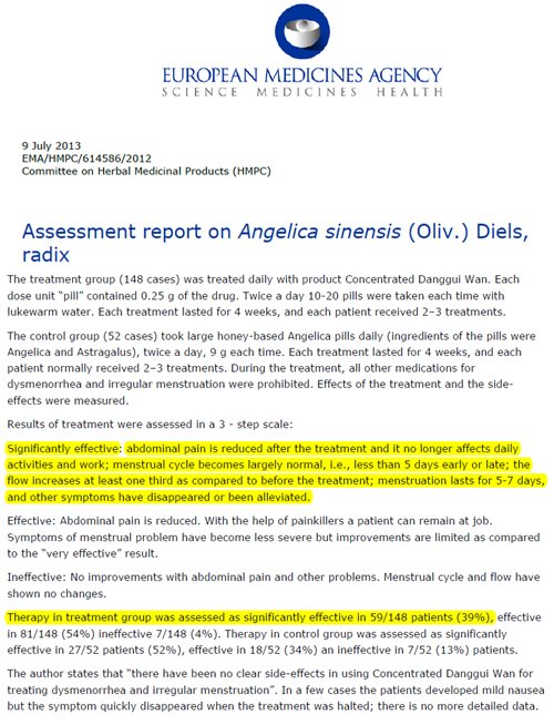 จากการศึกษาประสิทธิภาพของตังกุยในการลดอาการประจำเดือนมาไม่ปกติ พบว่าหลังจากรับประทานตังกุย 5 กรัม/วัน เป็นระยะเวลา 4 สัปดาห์ 39% มีอาการปวดท้องลดลง และประจำเดือนมาเป็นปกติมากขึ้น