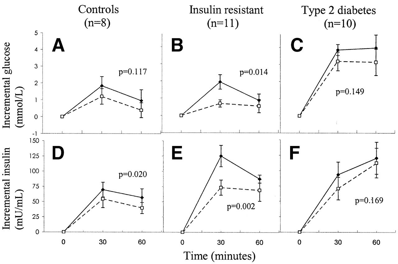 Effects of vinegar (□) and placebo (⧫) on plasma glucose (A–C) and insulin (D–F) responses after a standard meal in control subjects, insulin-resistant subjects, and subjects with type 2 diabetes. Values are means ± SE. The P values represent a significant effect of treatment (multivariate ANOVA repeated-measures test).