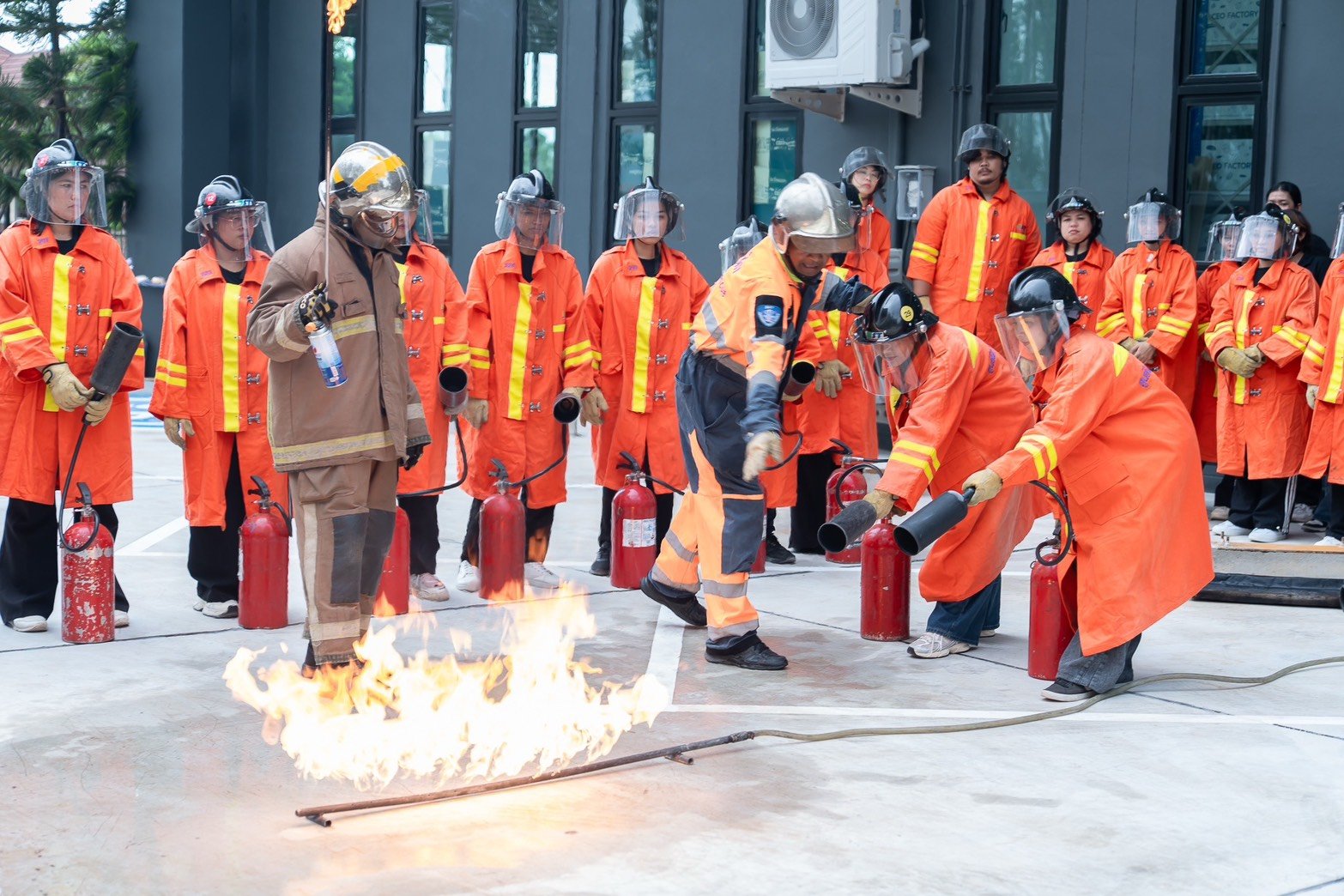 นอกจากนี้ยังมีการสาธิตวิธีใช้ถังดับเพลิงด้วยหลัก “ดึง – เล็ง – บีบ – กวาด” (PASS: Pull, Aim, Squeeze, Sweep) ให้พนักงานได้ทดลองใช้งานจริง