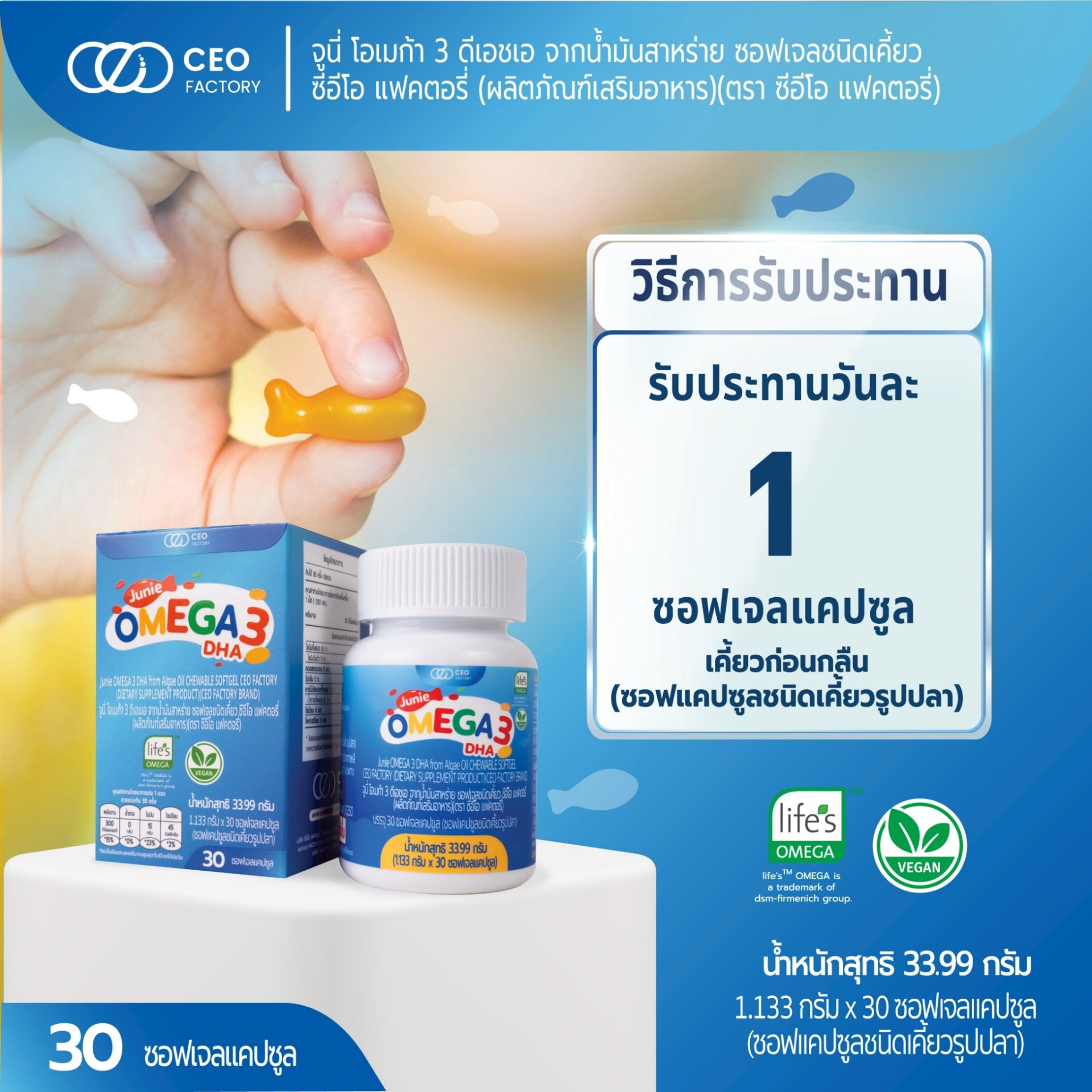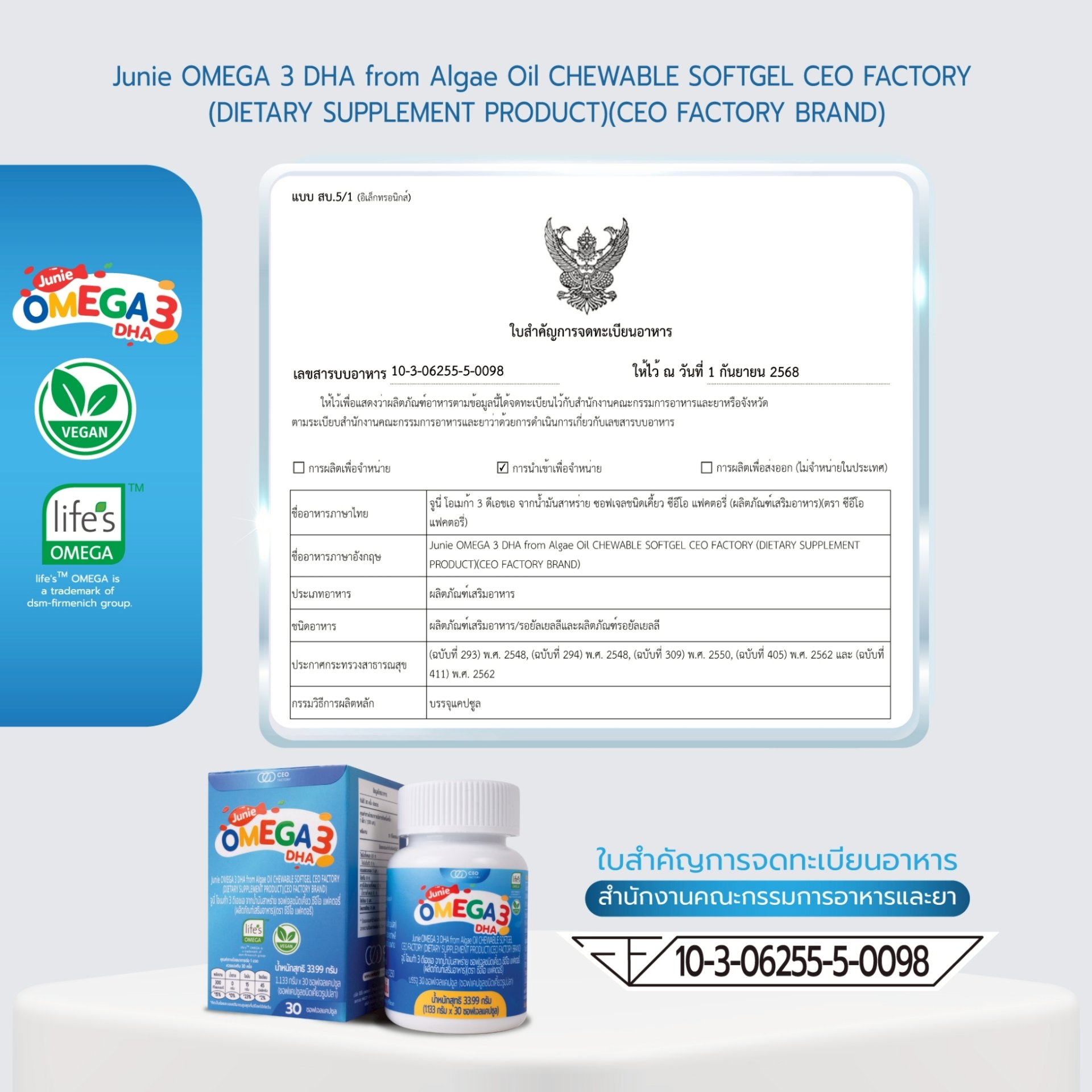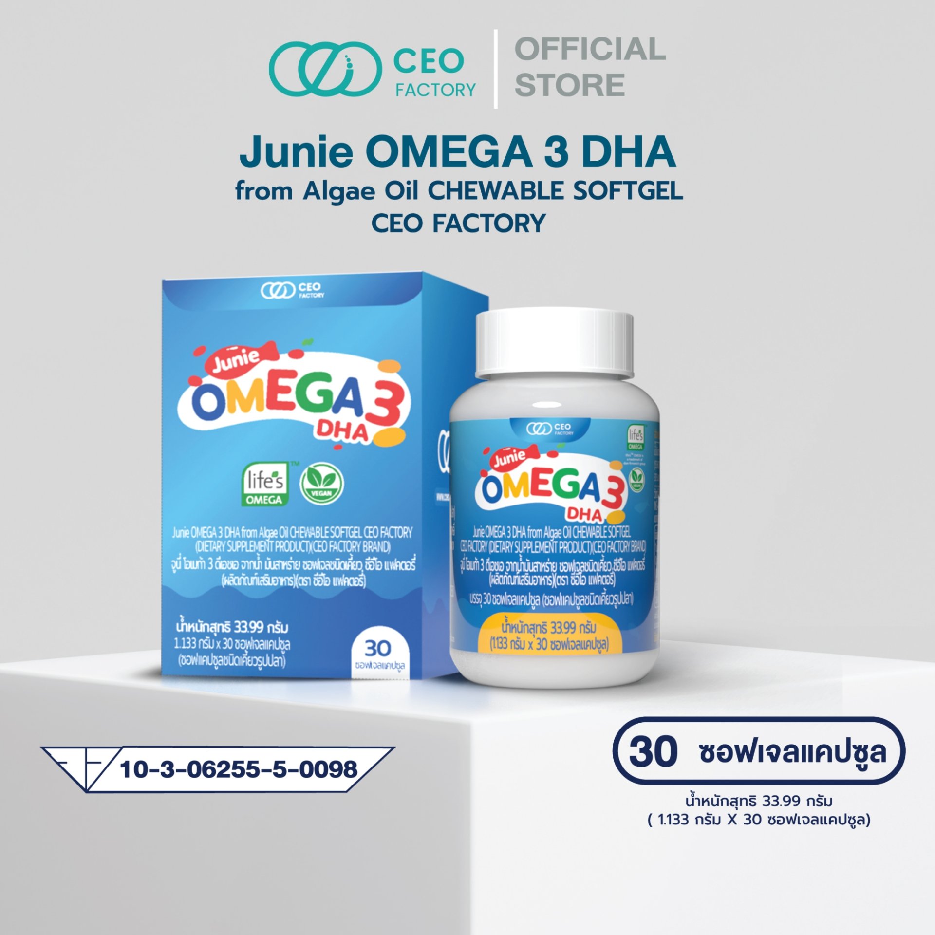 ผลิตภัณฑ์เสริมอาหาร ตรา ซีอีโอ แฟคตอรี่ Junie Omega 3 DHA ซอฟเคี้ยว from Algae Oil Chewable Softgel 1 กระปุก บรรจุ 30 ซอฟเจล อย.10-3-06255-5-0098