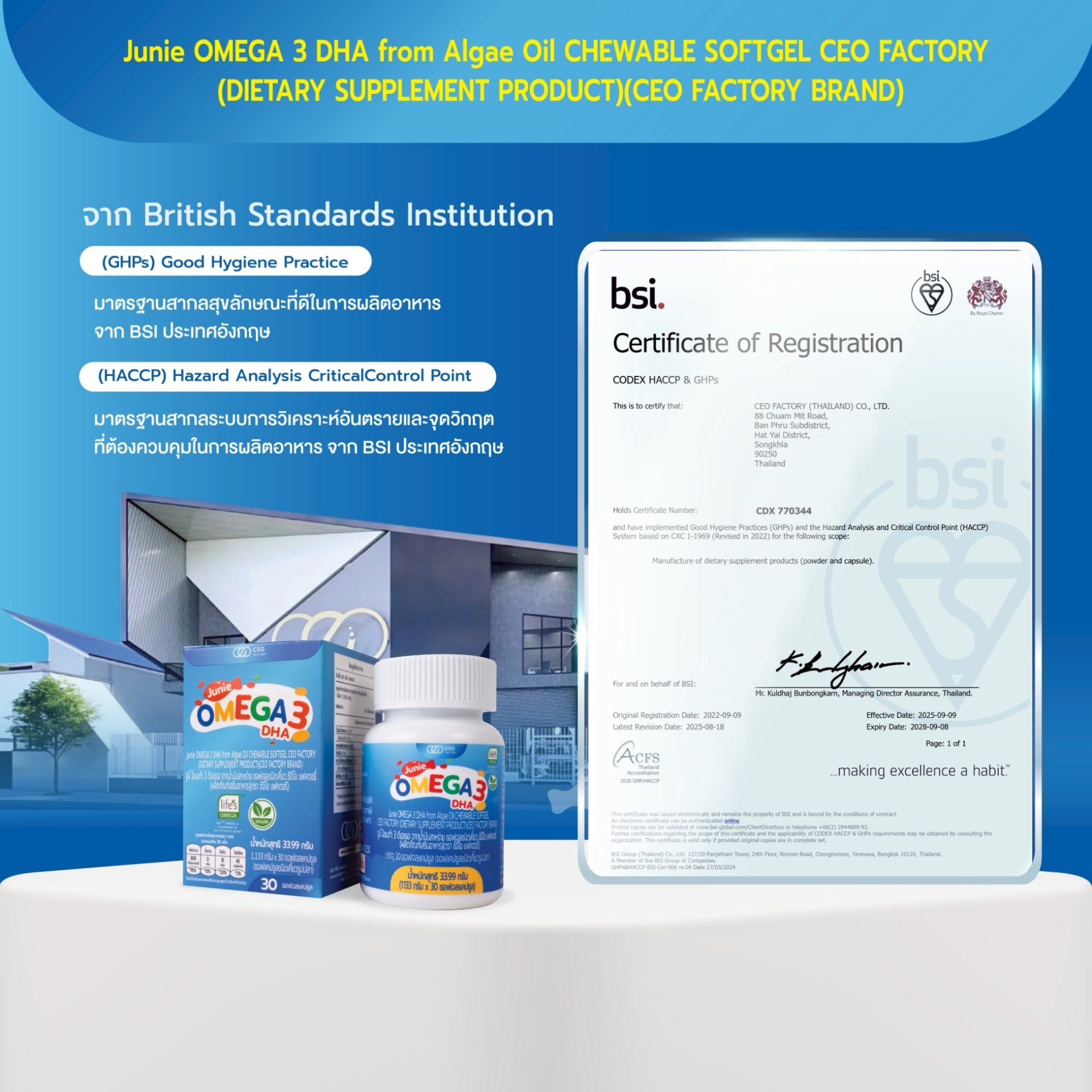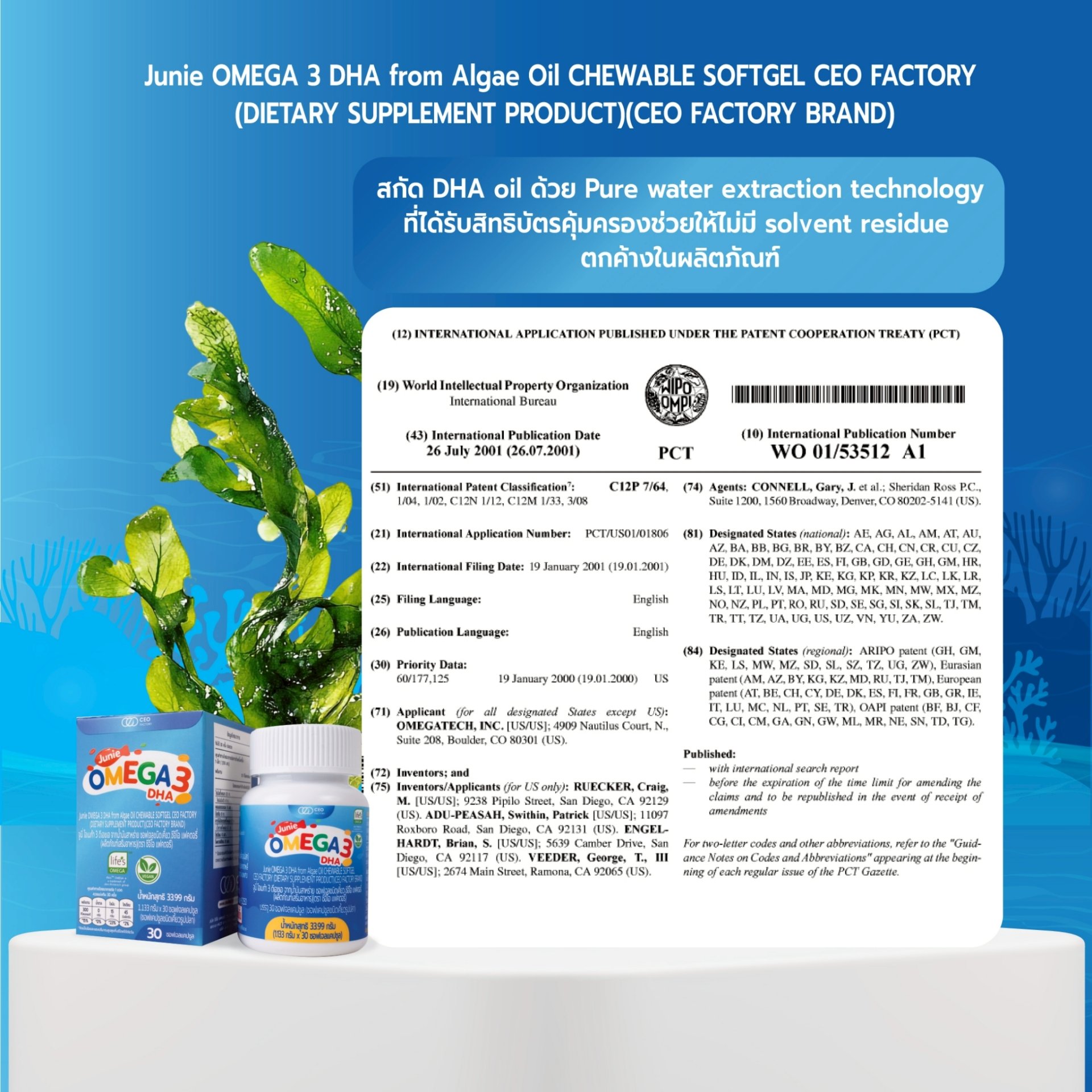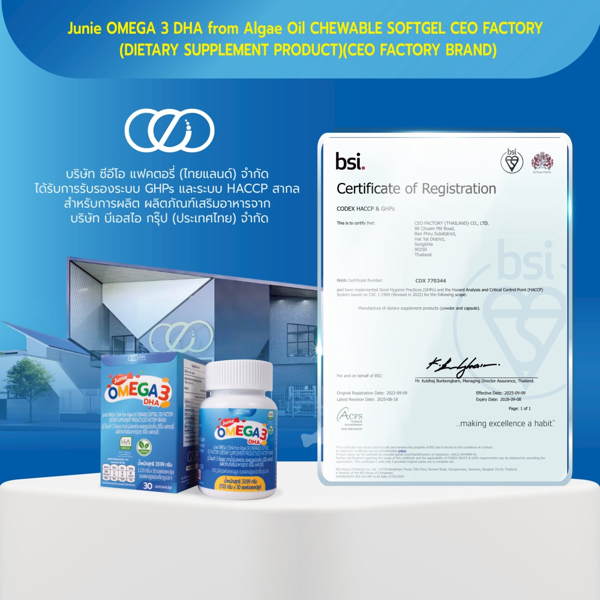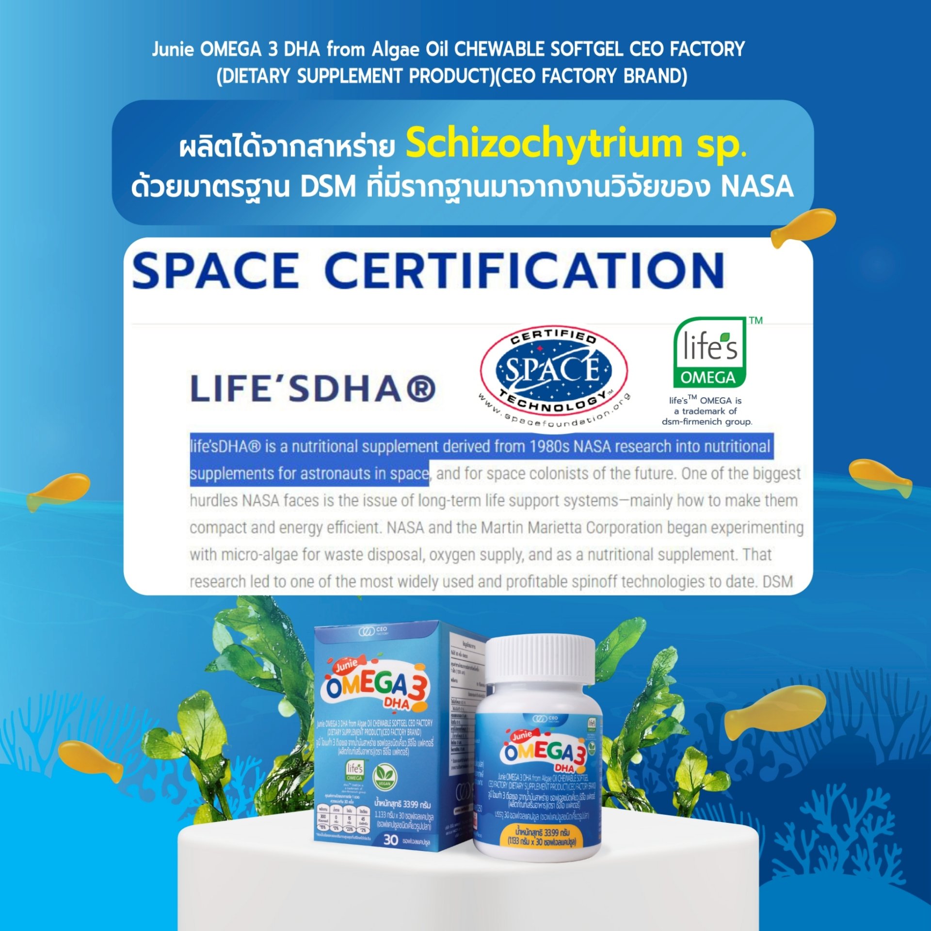 ผลิตภัณฑ์เสริมอาหาร ตรา ซีอีโอ แฟคตอรี่ Junie Omega 3 DHA ซอฟเคี้ยว from Algae Oil Chewable Softgel 1 กระปุก บรรจุ 30 ซอฟเจล อย.10-3-06255-5-0098